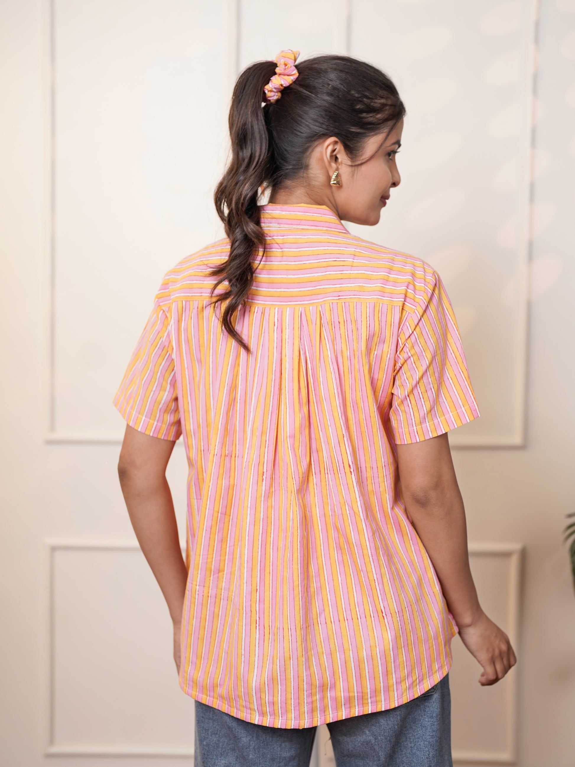 A soft whisper of Jaipur’s artisanal charm, this pure cotton shirt top is handblock printed in radiant hues of pink, saffron, and marigold. With its relaxed silhouette, collared neckline, and short sleeves, it’s a breezy ode to everyday elegance—perfect for sunlit strolls, slow mornings, or spontaneous plans.