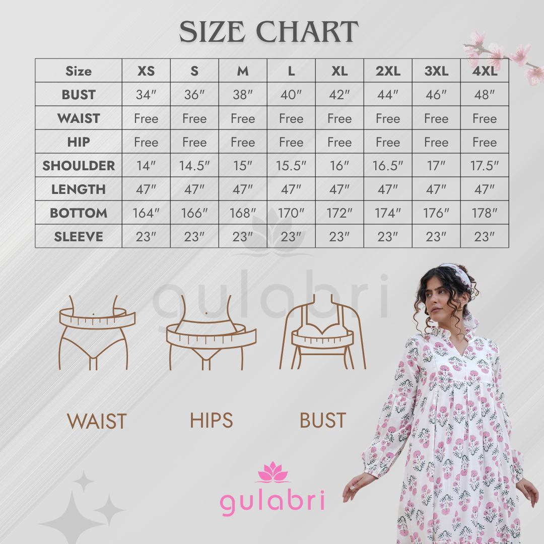 Say hello to sunshine days in our Elena HandBlock Floral Ruffle Dress. Crafted from the softest pure cotton and hand block printed with Gulabri's signature floral motifs in delicate pinks and greens, this easy-fit midi is a dreamy pick for slow mornings and breezy afternoons. The high ruffled collar, long sleeves with gathers, and tiered hem lend a romantic charm, while its flowing silhouette ensures everyday comfort. This dress is a thoughtful blend of comfort, craft, and quiet beauty.