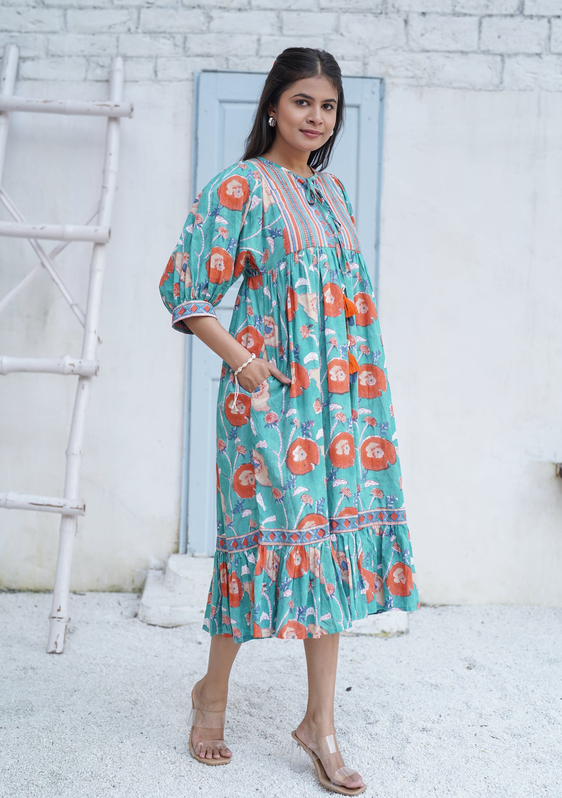 Say hello to sunshine in dress form. The Miraya Handblock Printed Garden Stroll Dress is a joyful swirl of hand block-printed florals on a breezy sea-green canvas, designed to make you feel like you’re walking through a watercolor garden. With its striped lace-up neckline, puffed sleeves, and tiered ruffle hem, this dress doesn’t just flow — it flirts. Crafted in feather-light pure cotton and finished with thoughtful details like tassels in front and hidden pockets, it’s your go-to for days when you want to look effortlessly radiant (and secretly comfy).